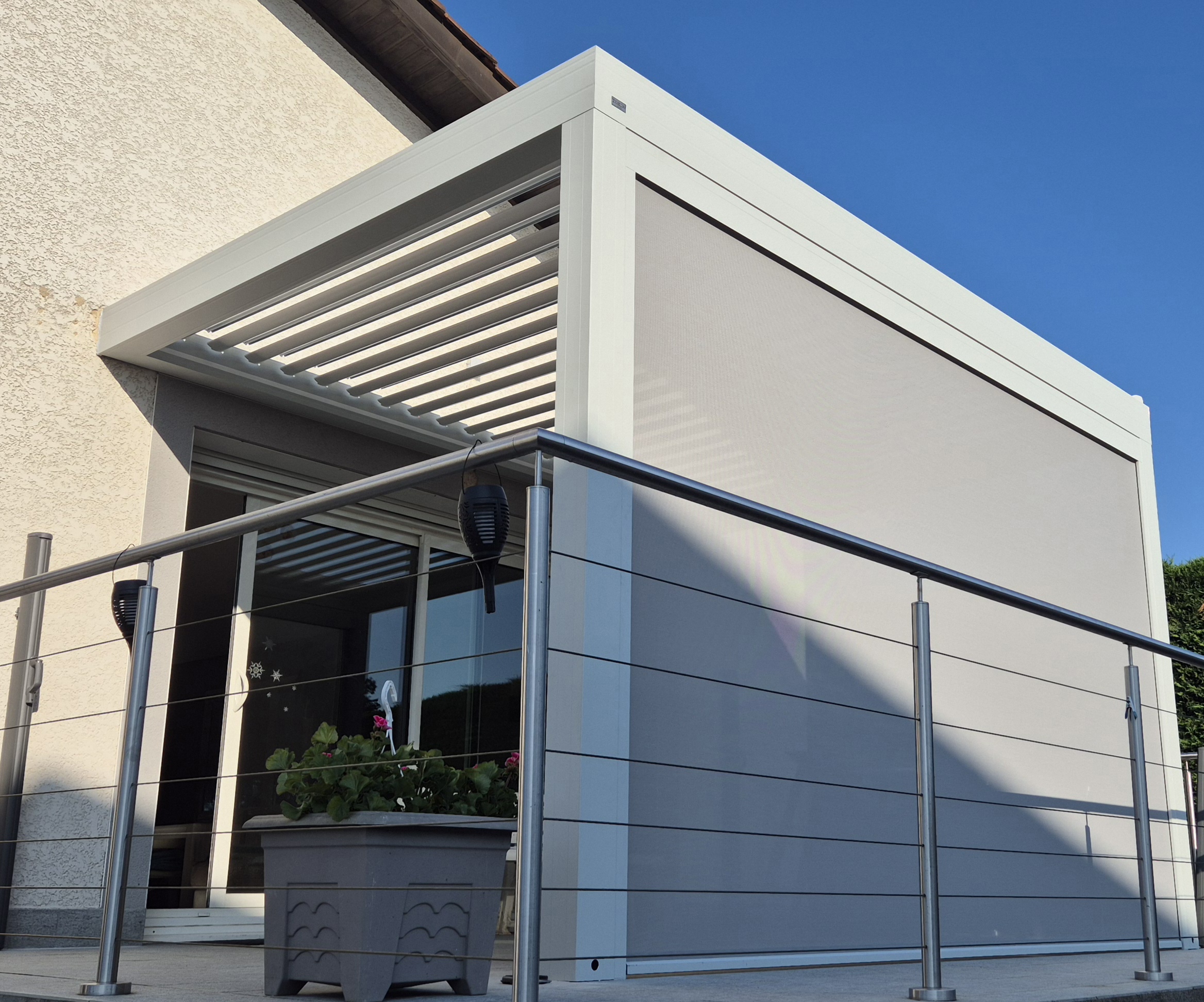 Nous proposons également l’installation de structures fixes en aluminium extrudé avec un store en toile pouvant se replier ou lames orientables, ces dernières préservent la luminosité en hiver.
